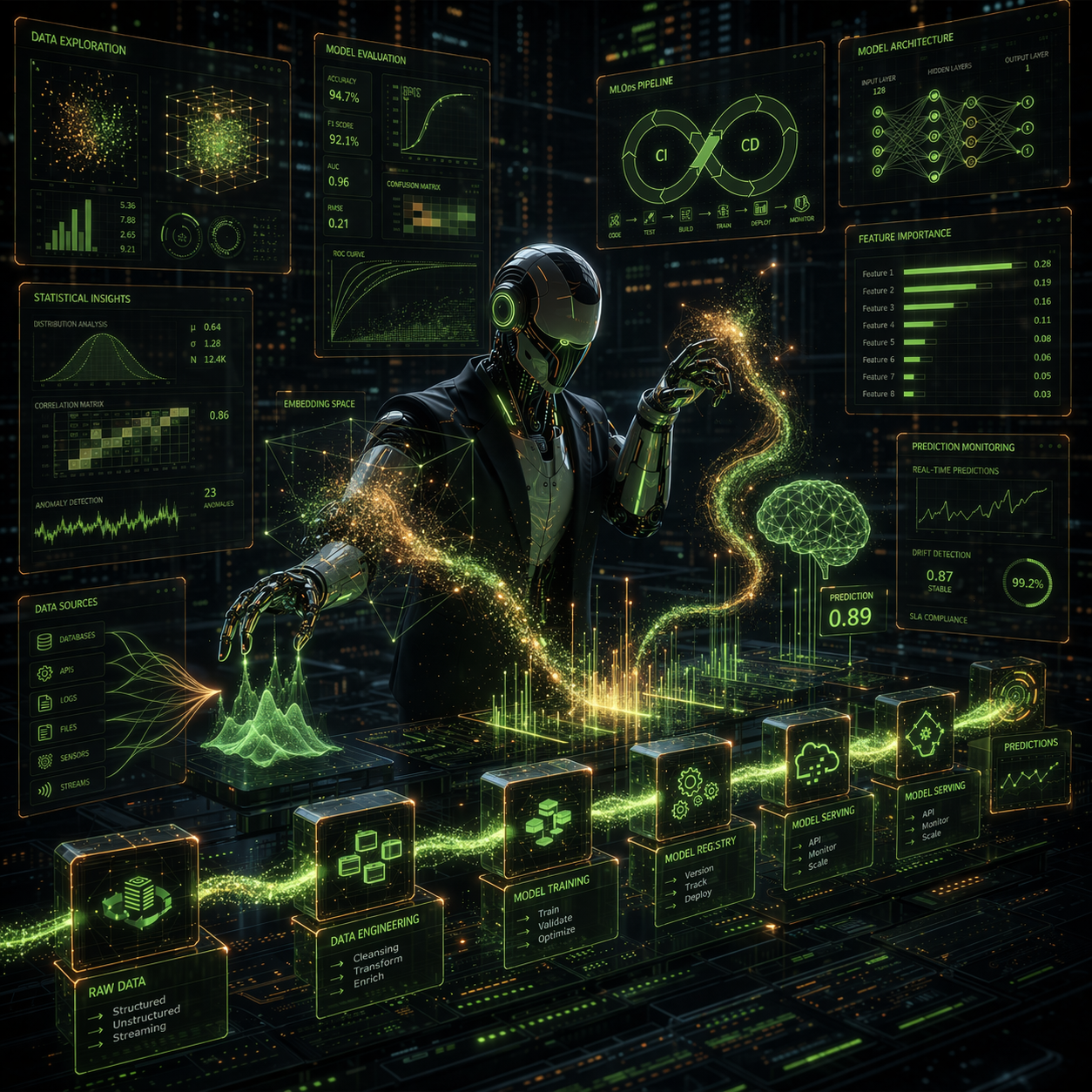 Incluye: gobierno de datos, pipelines ETL/ELT, feature stores, entrenamiento, despliegue, monitoreo (drift). Entregables: notebooks, datasets curados, modelos, endpoints, reportes. Add-ons: DataOps, catálogo de datos, calidad y linaje.