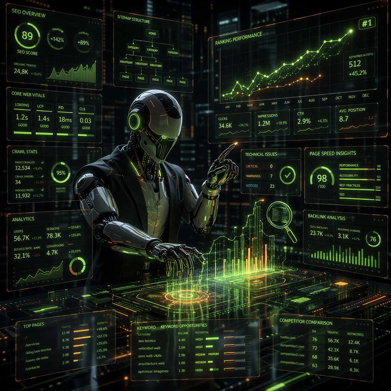 Incluye: Core Web Vitals, indexación, schema, sitemaps, performance, tagging GA4, Looker Studio. Entregables: auditoría, plan de mejoras, tableros y alertas. Add-ons: contenido pilar, clusters, linkbuilding técnico, hreflang.