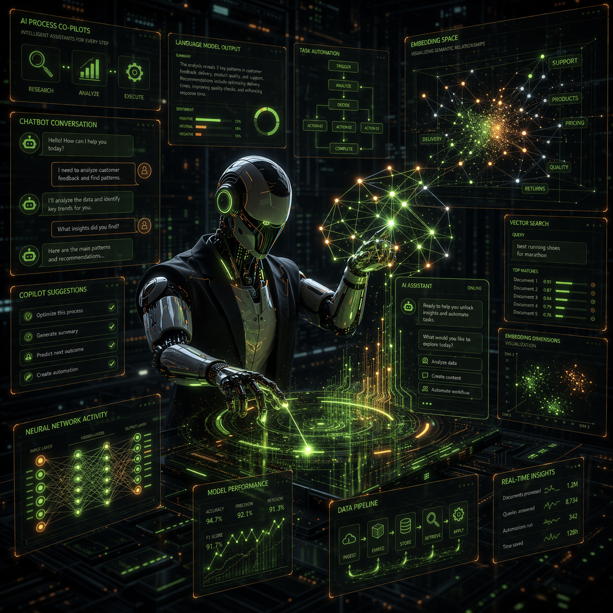 Incluye: asistentes para equipos, RAG sobre documentación, automatización con LLMs, moderation. Entregables: prompts/flows versionados, endpoints, métricas de calidad. Add-ons: on‑prem/híbrido, privacidad y cumplimiento, fine‑tuning.