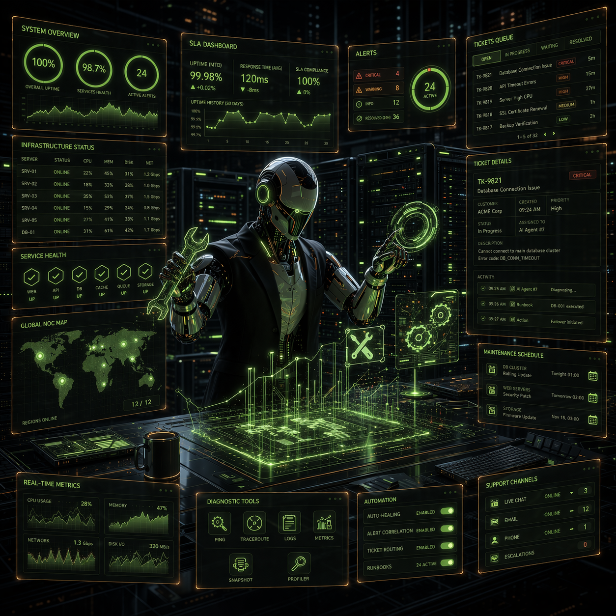 Incluye: mesa de ayuda, monitoreo 24/7, parches, incidentes, mejoras continuas. Planes: Básico, Profesional, Empresarial (tiempos de respuesta y alcance).