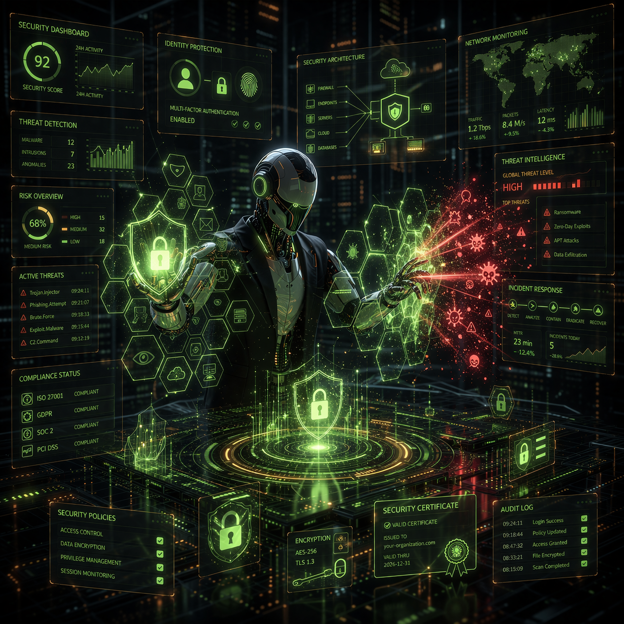 Incluye: hardening, pentesting liviano, gestión de secretos, backups, auditorías de acceso, políticas. Entregables: informe de riesgos, plan de mitigación, runbooks de incidentes.