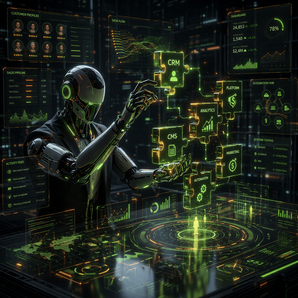 Incluye: selección de plataforma, migración de datos, personalización, roles/permisos, capacitación. Entregables: instancia productiva, manuales, KPIs operativos. Plataformas: WordPress/Woo, HubSpot/Zoho, Strapi, Directus.